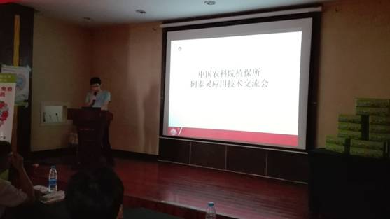 技術(shù)推廣老師梁增浩向與會的經(jīng)銷商介紹了“阿泰靈”作為世界第一個植物免疫蛋白質(zhì)生物農(nóng)藥的創(chuàng)制發(fā)展史,讓大家了解到“阿泰靈”發(fā)展的每一步艱辛歷程都凝聚了植保所和中保集團科研人員、技術(shù)推廣團隊的心血和汗水,所有的心甘情愿的付出都是為了實現(xiàn)給廣大百姓帶來一個真正的好產(chǎn)品,一個可以根本解決作物防效問題的好農(nóng)藥。梁老師的真情講解,得到了與會人員理解和認可的掌聲。