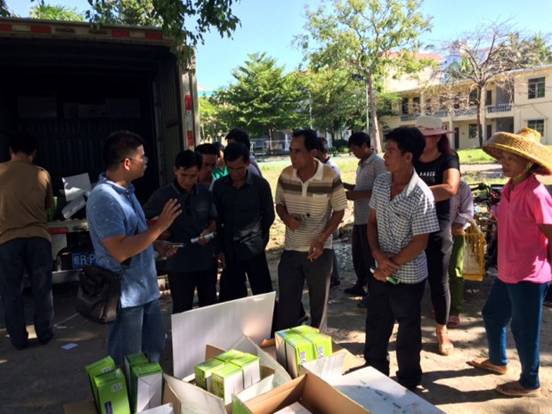 集團(tuán)公司海南區(qū)域經(jīng)理田生榮攜海南區(qū)域團(tuán)隊(duì)同三亞豐茂同和總經(jīng)理黃光輝隨同扶貧工作組負(fù)責(zé)人來(lái)到天涯區(qū)鄉(xiāng)村進(jìn)行農(nóng)資產(chǎn)品的派送。據(jù)悉,本次扶貧農(nóng)資主要以“阿泰靈”為主,派送期間,田經(jīng)理還現(xiàn)場(chǎng)講解作物栽培管理及病蟲害防治等相關(guān)植保知識(shí)以及創(chuàng)制型植物免疫蛋白質(zhì)生物農(nóng)藥“阿泰靈”的產(chǎn)品特性和使用方法,指導(dǎo)農(nóng)戶用“好藥”,用好“藥”。