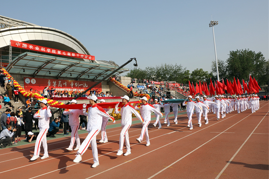 入場式上,2500余名職工、學生分別組成的儀仗隊和各代表隊,在歡快的運動員進行曲中,邁著整齊矯健的步伐進入賽場,以充滿活力和獨具特色的亮相表演,展示院所職工朝氣蓬勃、團結向上的精神風貌。