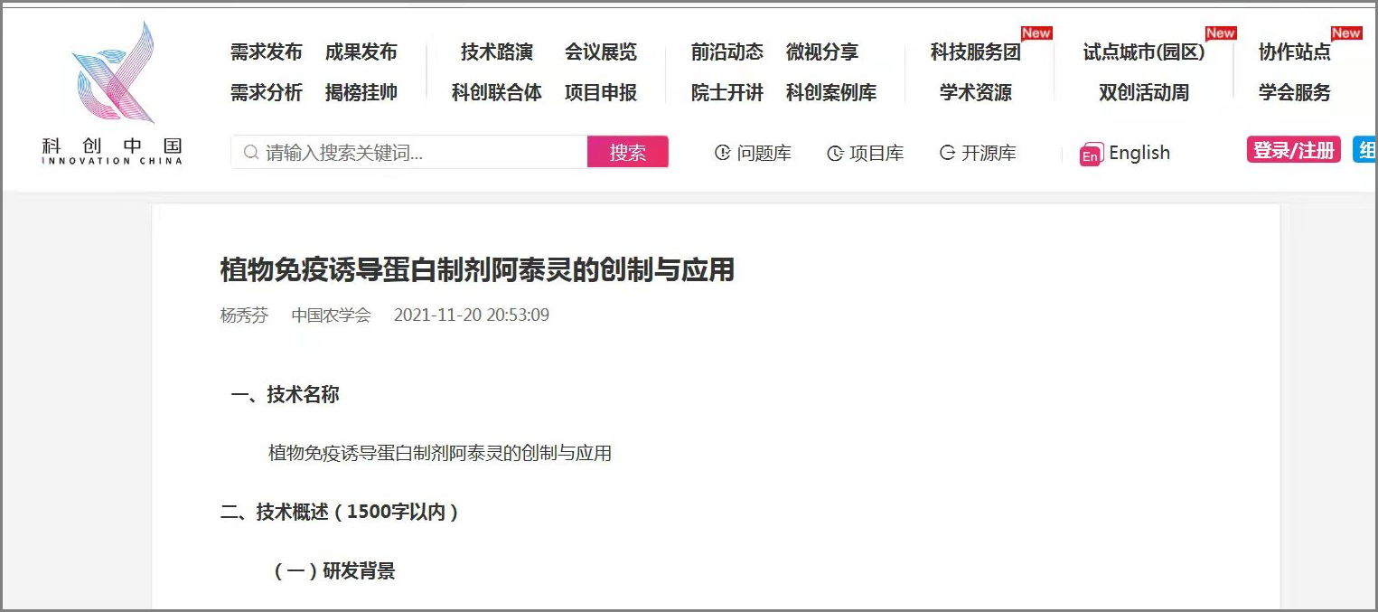 植物免疫誘導(dǎo)蛋白制劑阿泰靈的創(chuàng)制與應(yīng)用”得到評審專家的認(rèn)可,成功入選并入駐“科創(chuàng)中國” ...全文